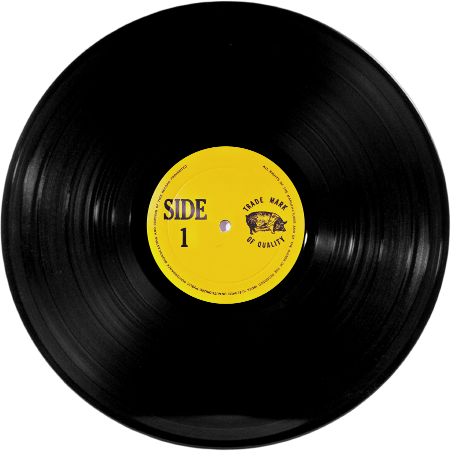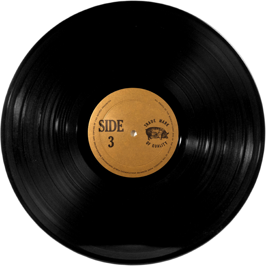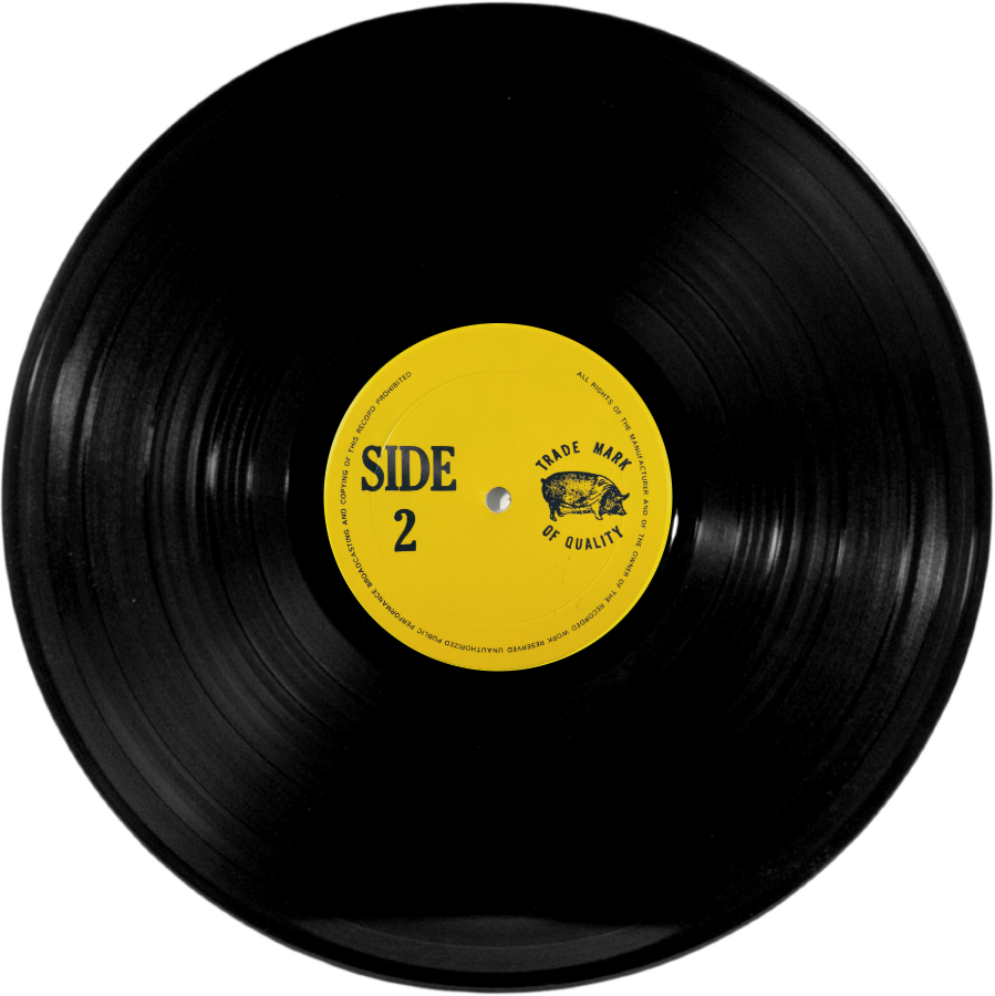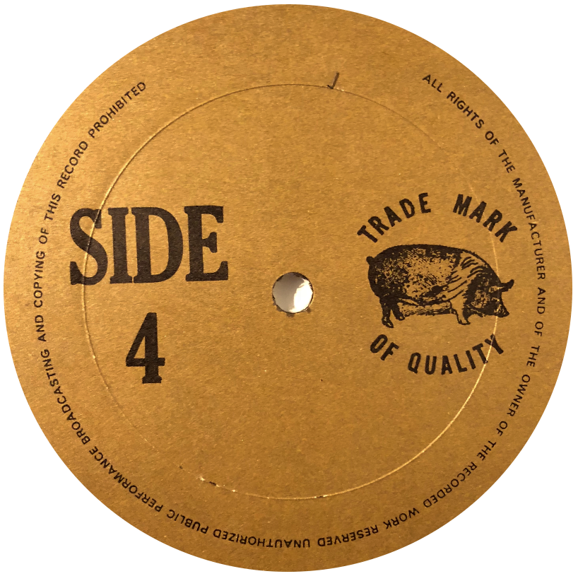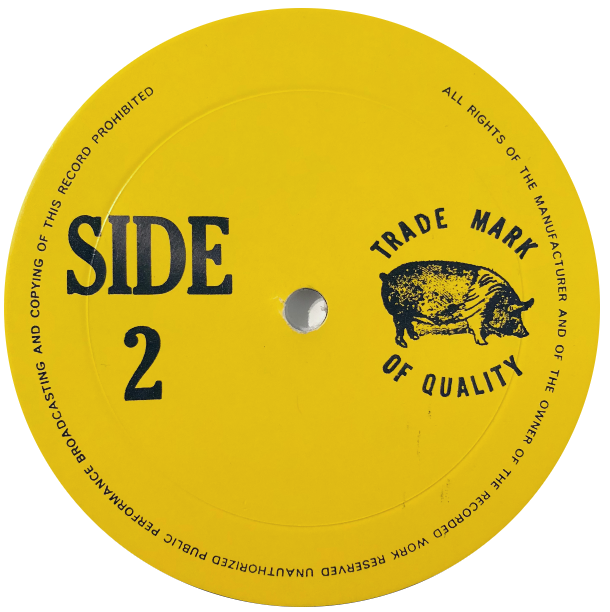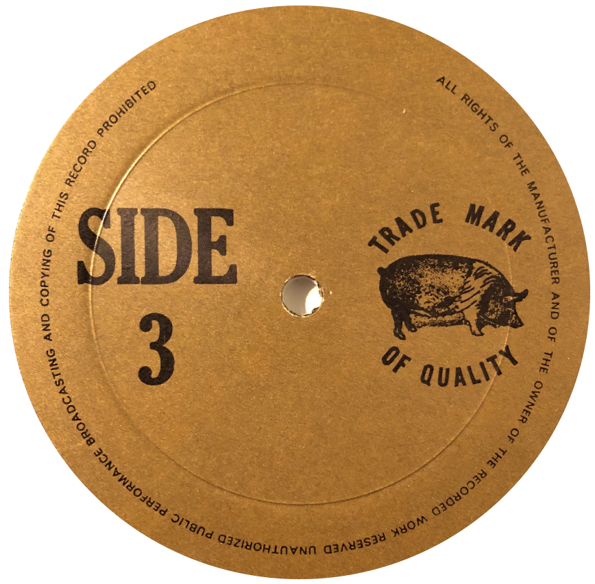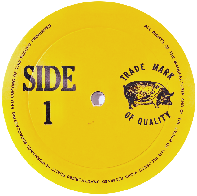 – Yellow (side 1 & 2) & brown (side 3 & 4) labels (farm pig) – found on black vinyl